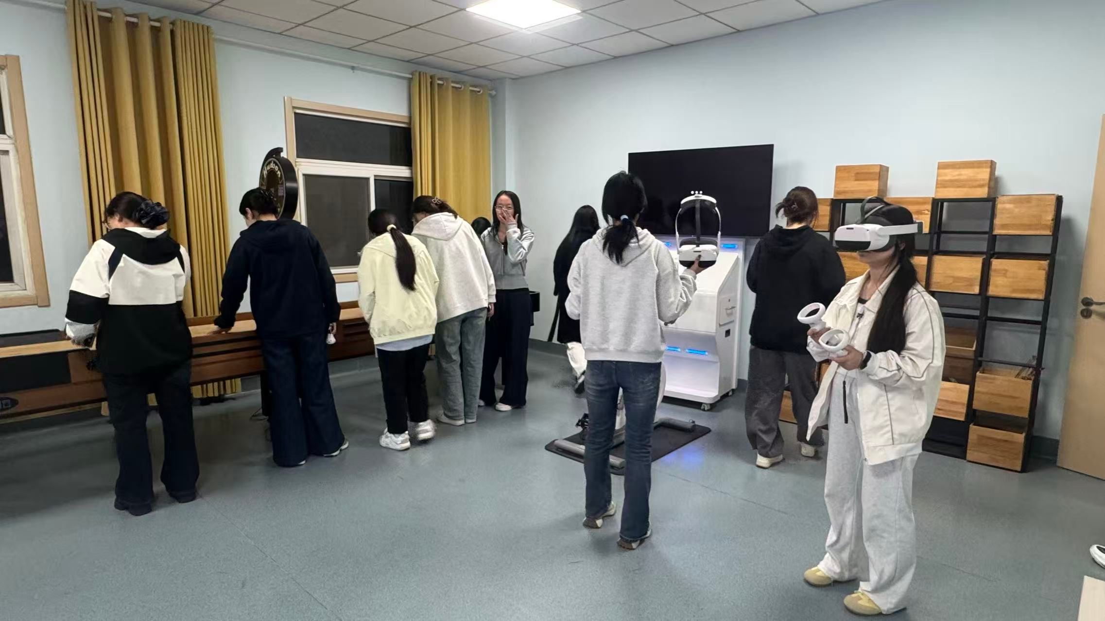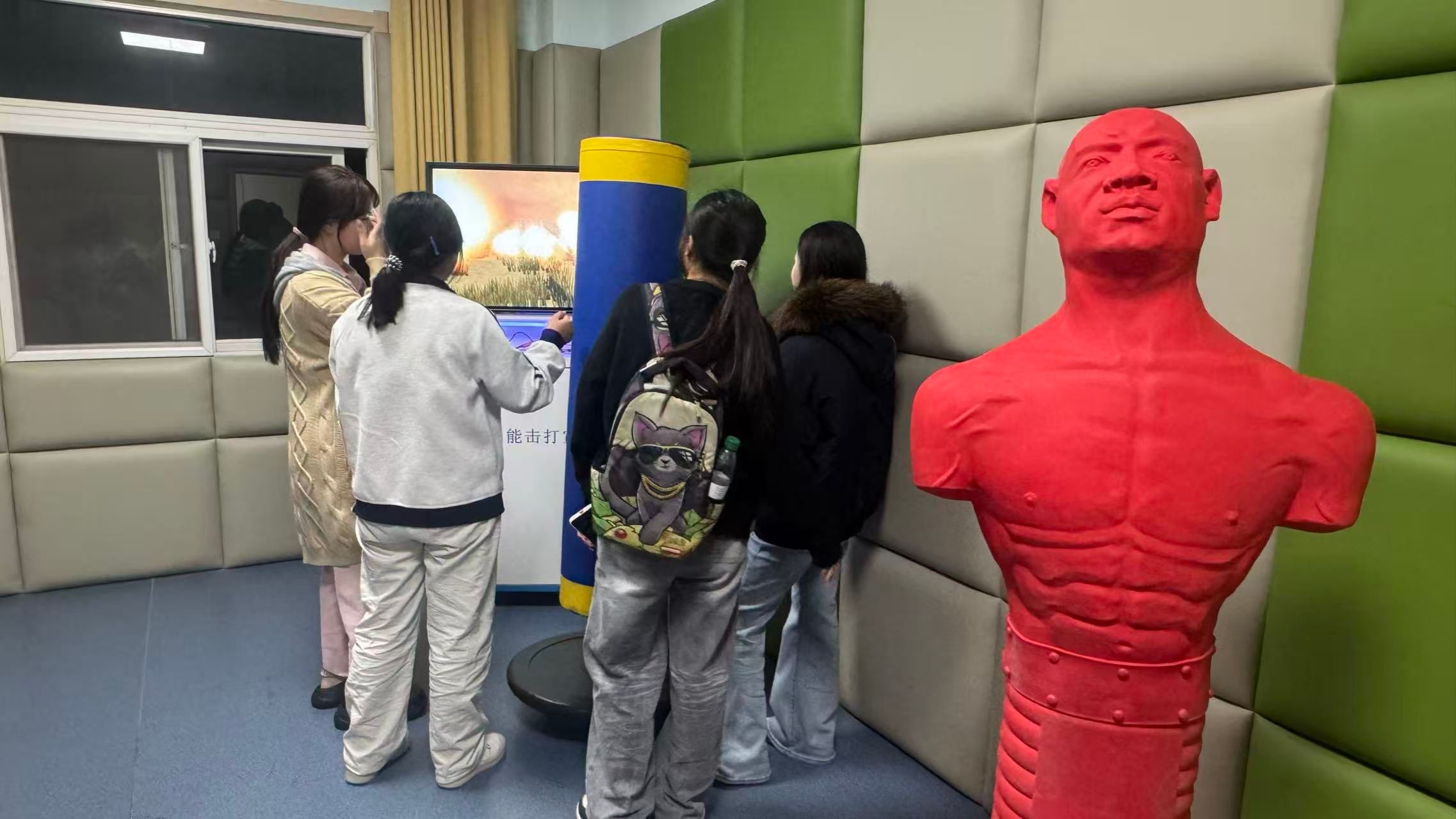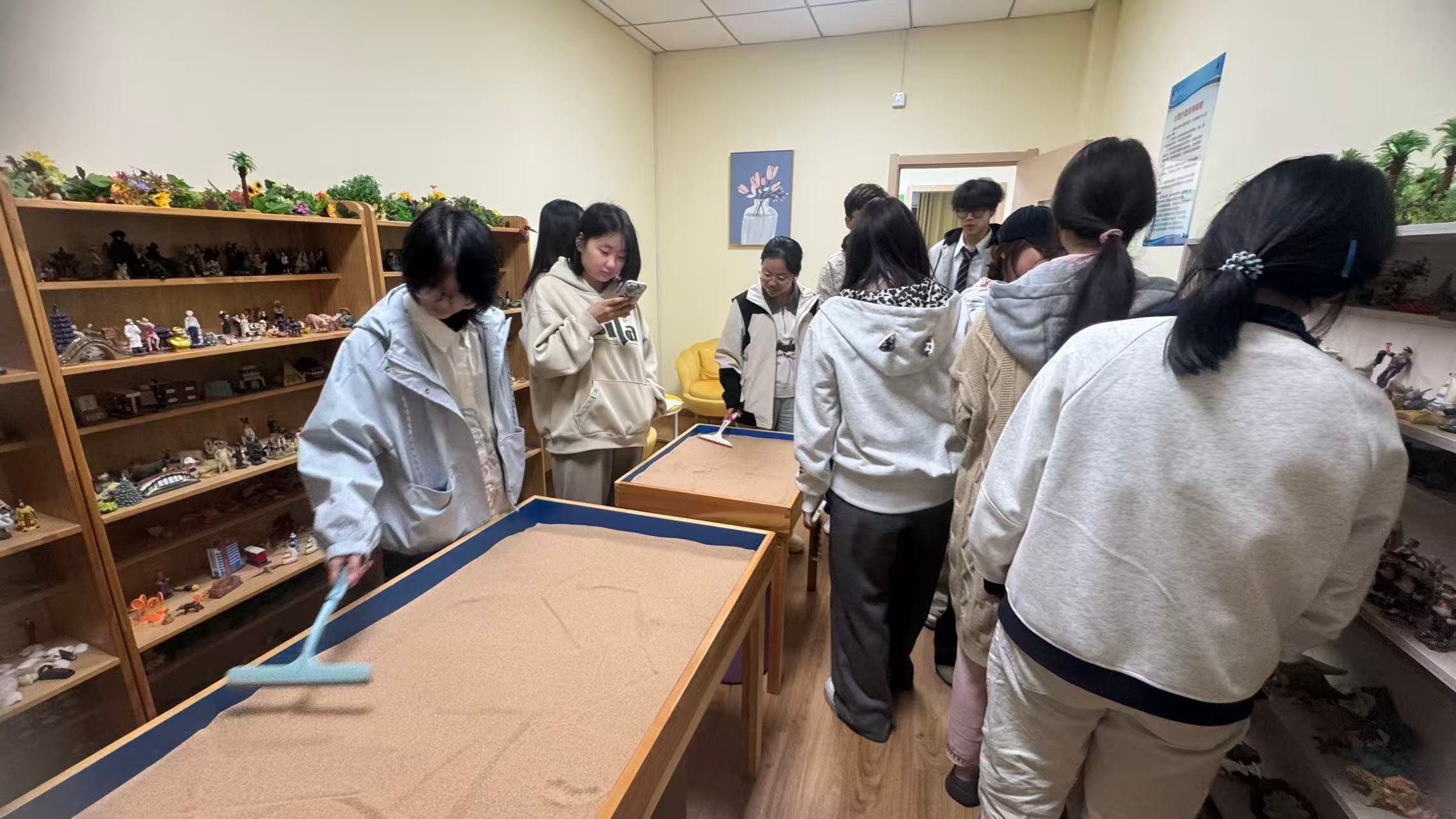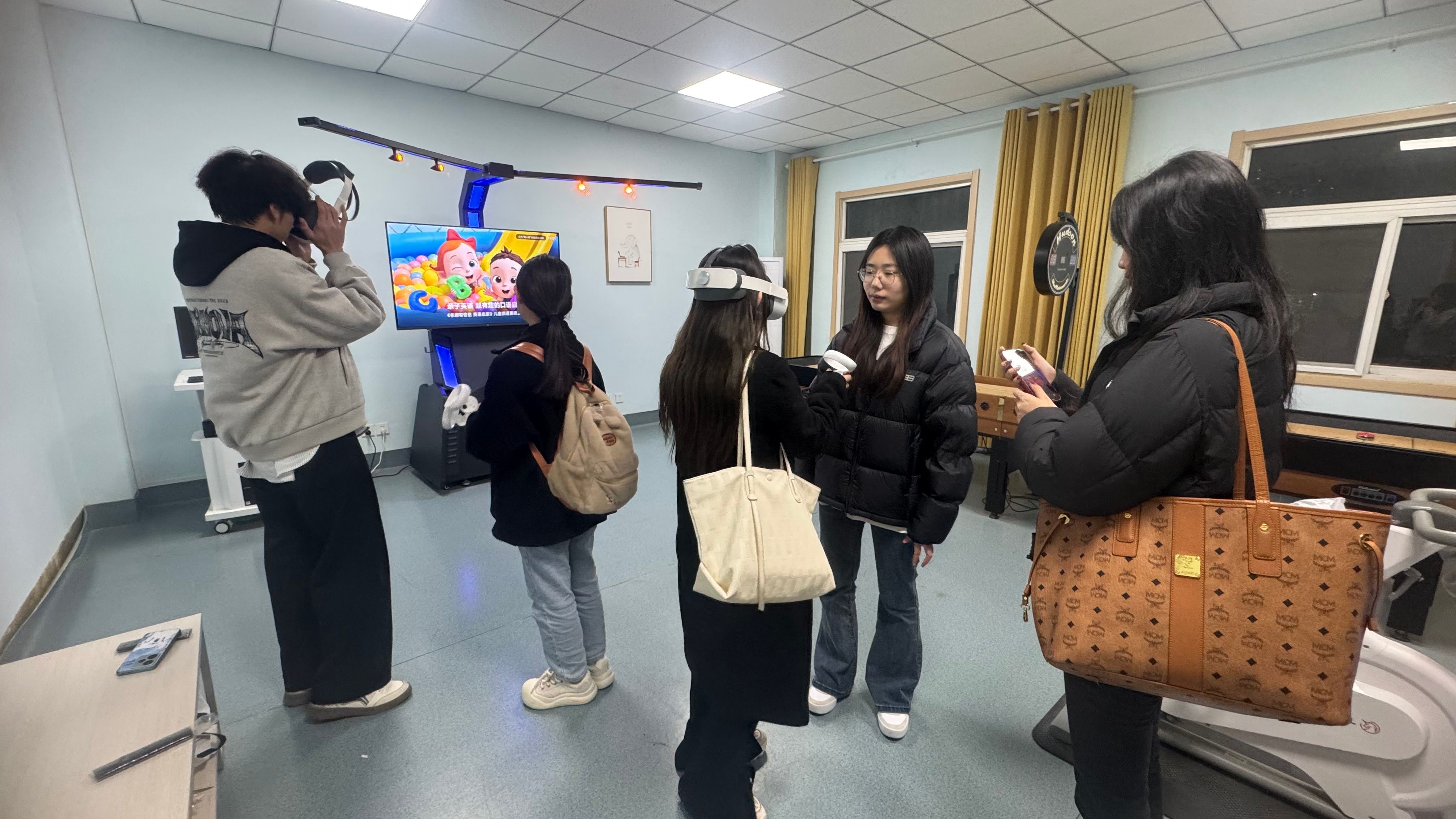 新生们依次参观了团体辅导室、沙盘游戏室、情绪发泄室等功能部室。同学们亲身体验了中心的各类专业仪器设施,通过尝试了击打情绪宣泄装置,体验VR骑行小游戏等等,真正体会到了调节情绪、释放压力的效果,对心理健康中心的工作有了更直观、更深入的认识,并且深刻体会到了公司对同学们心理健康成长的关心与支持。