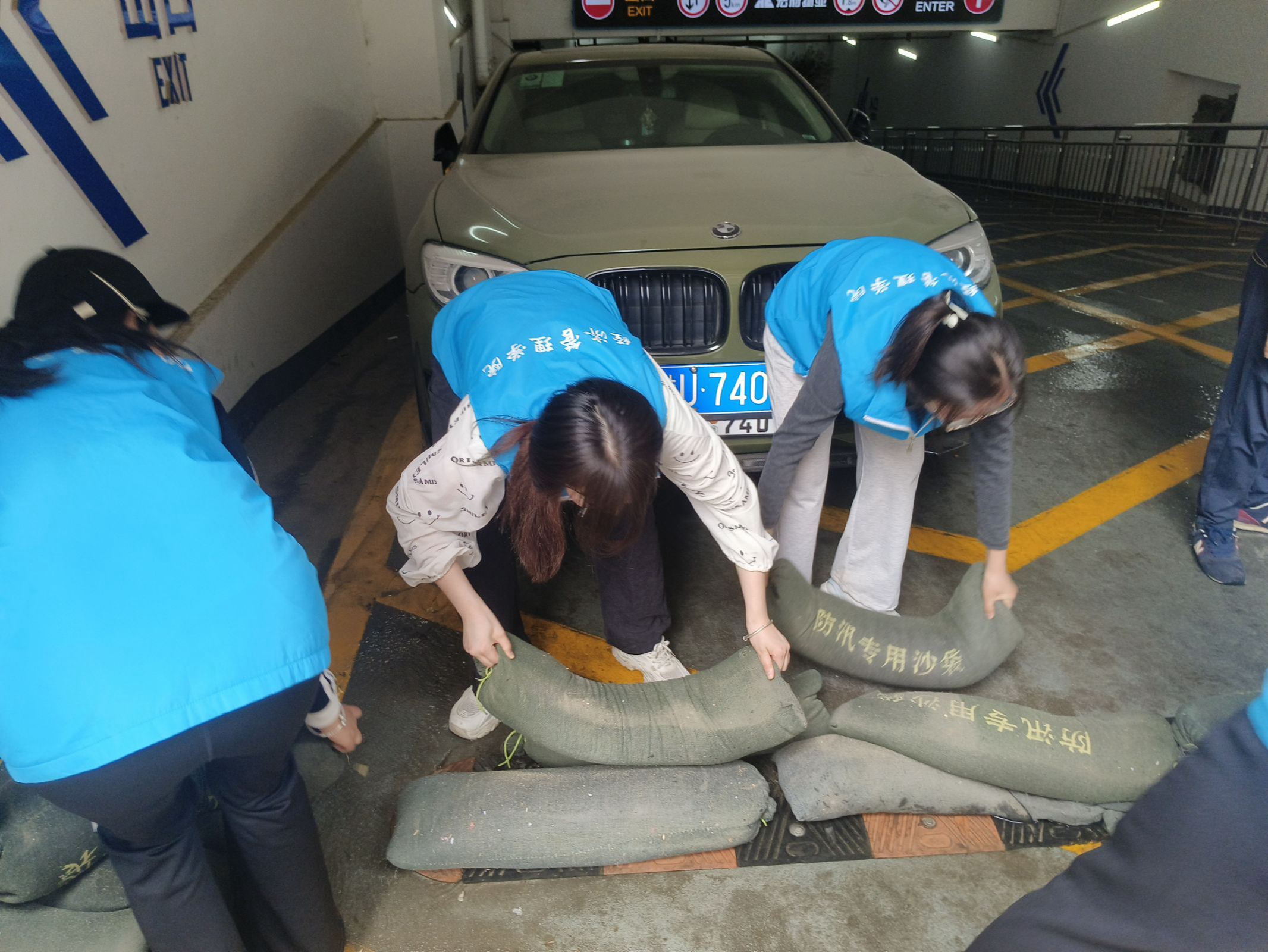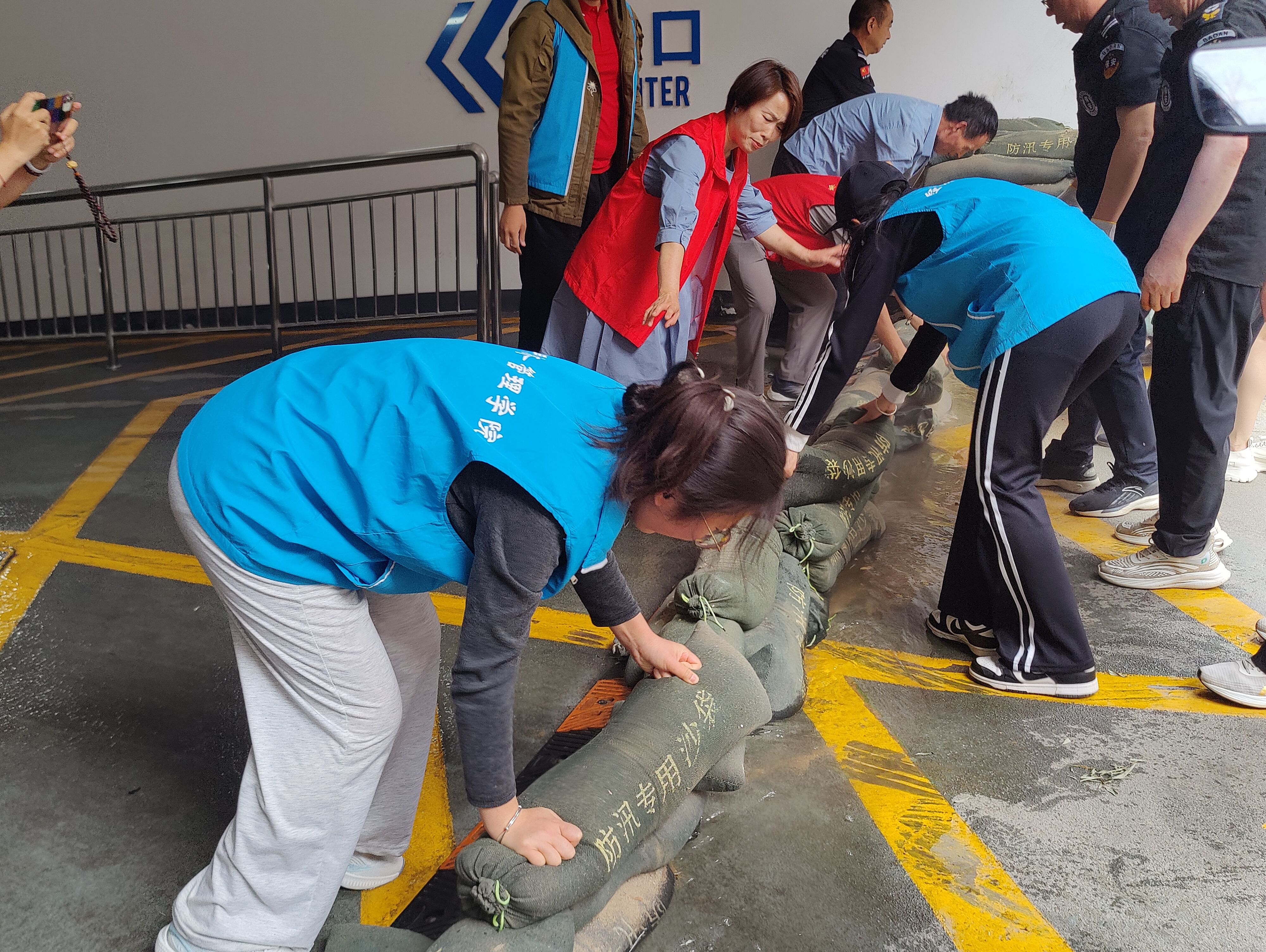 社区工作人员、志愿者们协同配合,堆筑防汛沙袋。