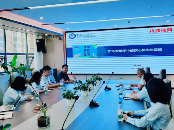 殷培伟基于国企从业经验和教学科研积累,以《市场营销学中的核心概念与策略》为题,将核心概念、经典理论与业务实操、鲜活案例相结合,为西安八块钱网络科技有限公司总部全体业务骨干讲授了一堂精彩的市场营销课。