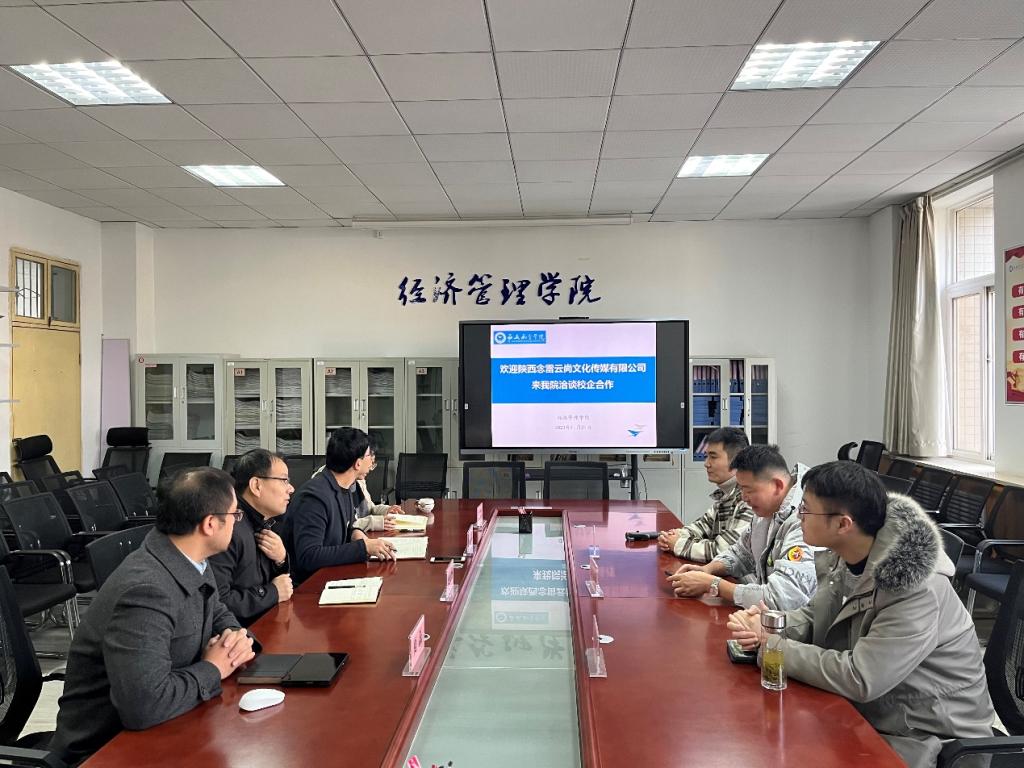 2023年11月21日上午,陕西念雷云尚文化传媒有限公司总经理董安源一行4人来beats365唯一官方网站交流校企合作事宜,公司班子成员史亚洲、张鹏及电子商务专业部分教师参加活动。