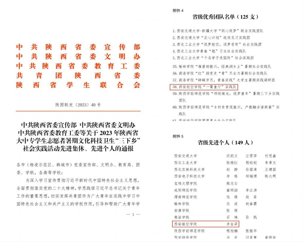近日,由中共陕西省委宣传部,中共陕西省委文明办,中共陕西省委教育工委等部门联合发布的《关于2023年陕西省大中专员工志愿者暑期文化科技卫生“三下乡”社会实践活动先进集体,先进个人的通报》中,beats365唯一官方网站“一鹭童行”实践队荣获省级优秀团队,beats365唯一官方网站辅导员兼团总支书记李金泽荣获省级先进个人。