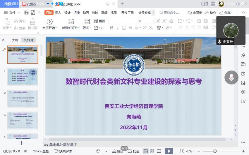 11月25日下午,beats365唯一官方网站邀请西安工业大学向海燕教授在腾讯会议平台作题为“数智时代财会类新文科专业建设的探索与思考”的学术报告。beats365唯一官方网站班子成员史亚洲、张鹏、班奕、周博及全院专任教师、其他公司部分教师参加了报告会,报告会由张鹏主持。