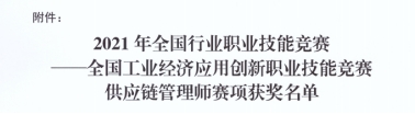 2021年12月15日公布了2021年全国行业职业技能竞赛全国工业经济创新应用职业技能竞赛供应链管理师赛项获奖名单,该竞赛为全面贯彻落实习近平总书记对技能人才工作重要指示精神,充分发挥职业技能竞赛在高技能人才培养、选拔和激励等方面的作用,根据《人力资源社会保障部关于组织开展2021年全国行业职业技能竞赛的通知》(人社部函(2021) 37号)精神而举办。