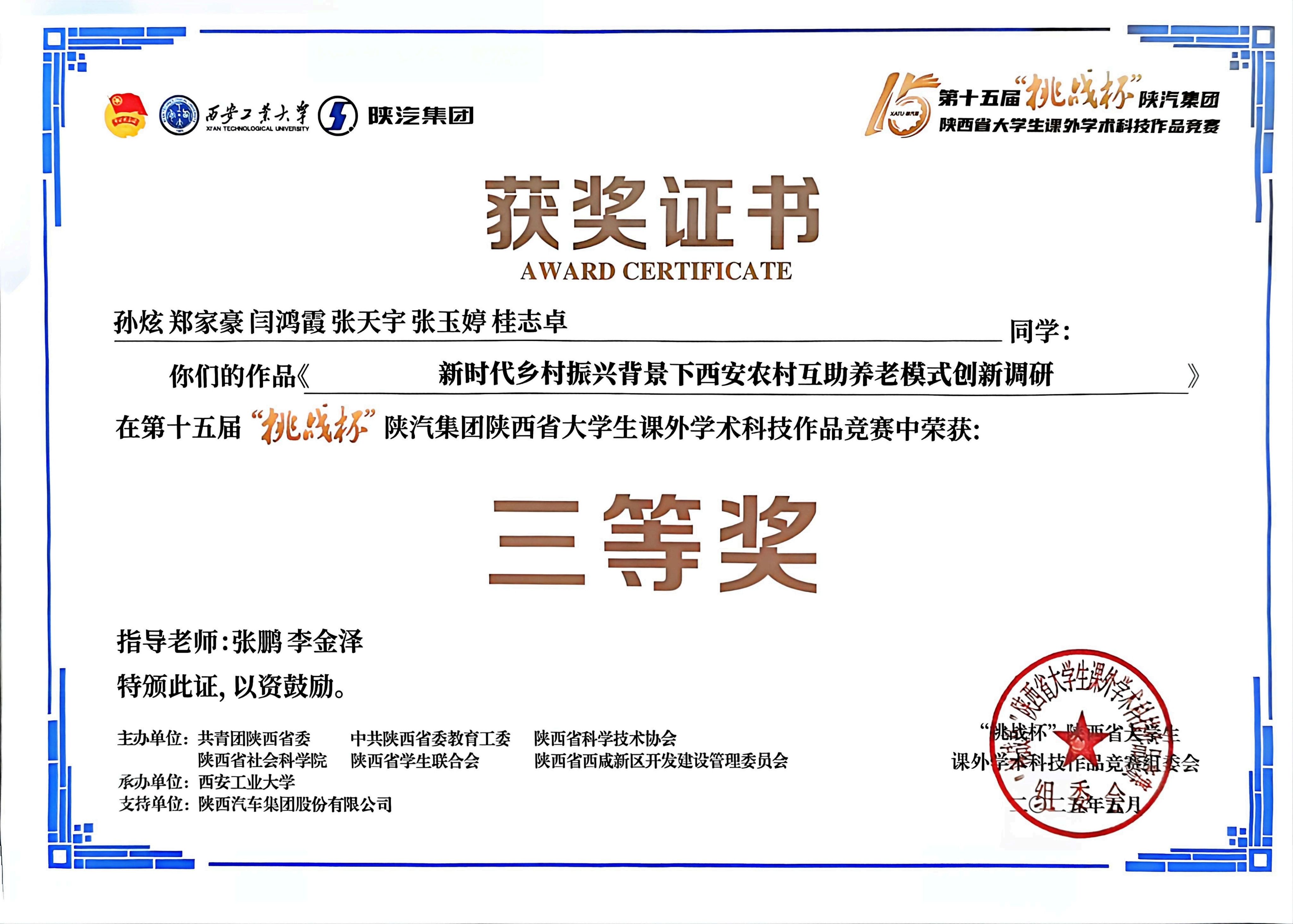 beats365唯一官方网站积极响应公司通知要求,经过前期组织报名、公司打磨、公司推荐,由张鹏、李金泽老师指导、公司本科不同专业的六名同学合作完成的参赛作品《新时代乡村振兴背景下西安农村互助养老模式创新调研》荣获省级三等奖。