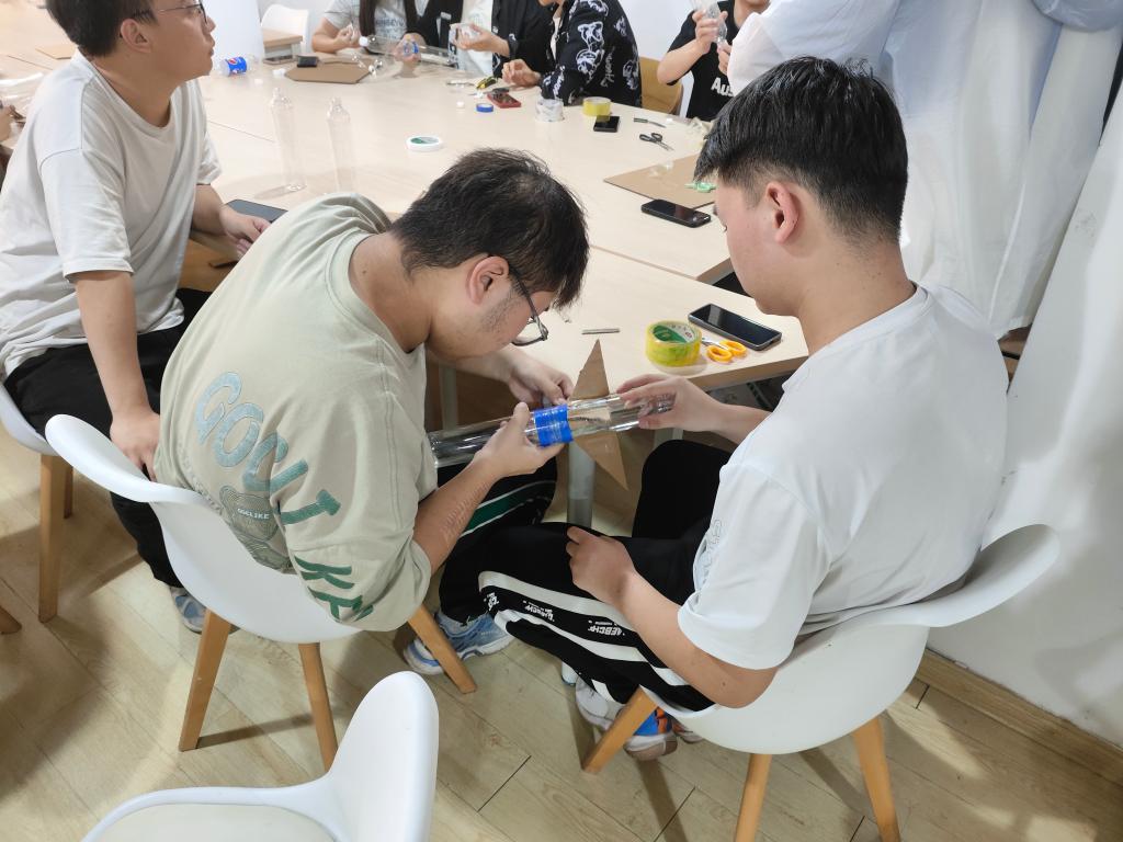 同学们积极参与,一个个废弃的饮料瓶在他们的奇思妙想下摇身一变为精美的水火箭。不久后,各式水火箭亮相,选手们围绕发射原理、火箭结构与特点、设计理念及设计过程等维度进行作品介绍。