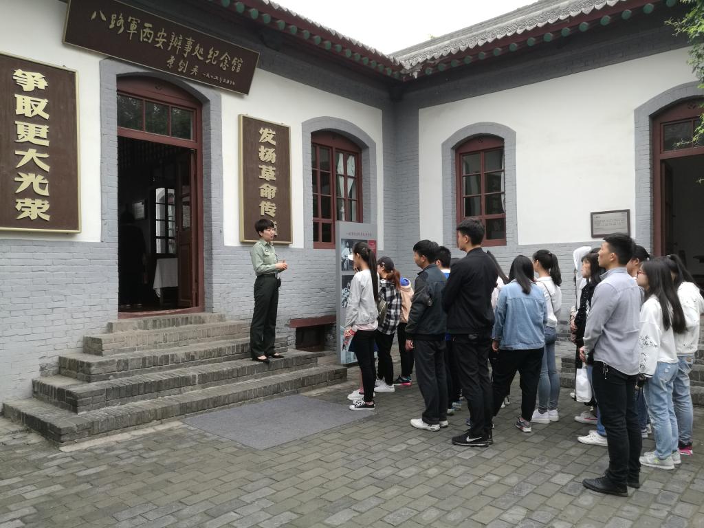 上午九时,师生们来到了位于西安市北新街七贤庄的八路军西安办事处纪念馆,在讲解员的带领下进行学习参观。八路军西安办事处在全国所有八路军、新四军办事处中成立最早,坚持斗争时期最长、影响最大。八路军西安办事处旧址又名七贤庄。1936年,中国共产党在七贤庄一号设立了红军驻西安联络处,1937年抗日战争爆发,红军驻西安联络处改为国民革命军第八路军驻陕办事处,叶剑英、林伯渠和董必武先后为八路军驻陕办事处党代表。党和军队的主要领导人周恩来、朱德、刘少奇、彭德怀、叶剑英、邓小平等多次在此工作、居住,白求恩、柯棣华和巴苏大夫、美国进步作家史沫特莱也在此居住过。珍贵的图片及实物资料鲜明地反映了办事处为宣传党的抗日民族统一战线政策,组织抗日救亡运动,输送进步青年到延安参加革命,支援抗战胜利作出的突出贡献。