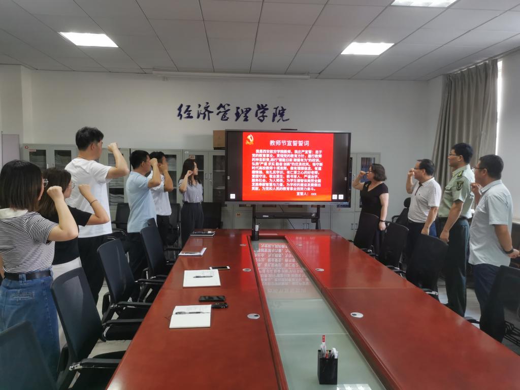 组织教师宣誓活动。常缨征老师带领与会教师进行了庄严的宣誓。参与宣誓的老师纷纷表示要践行誓词诺言,忠于党的教育事业,履行教师的神圣职责,恪守新时代高校教师十项准则,争做“四有”好老师,切实增强教师教书育人责任感、使命感和荣誉感。